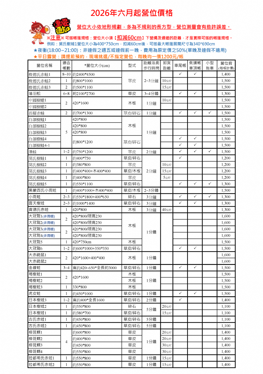*每帳篷1100元/天:日本樹蛙1、日本樹蛙2、古氏赤蛙1 、古氏赤蛙2